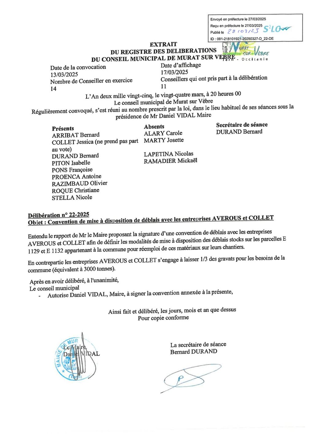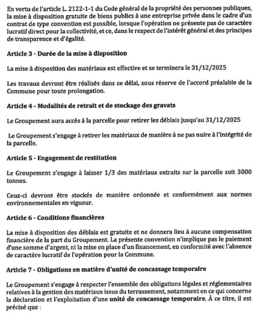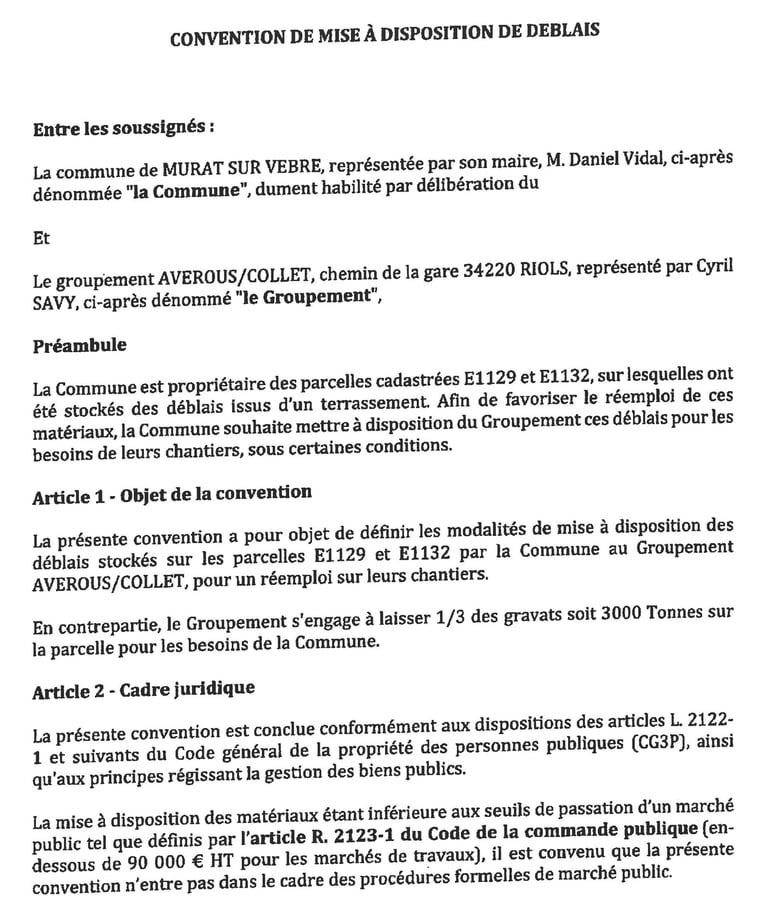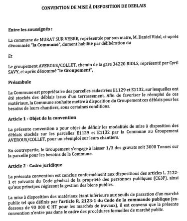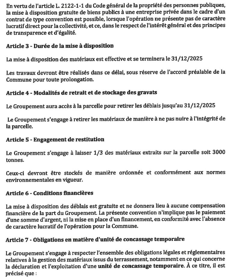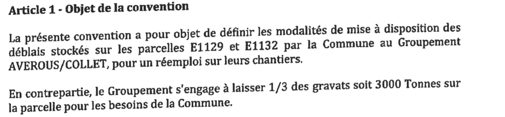 Puis fin 2024, l’entreprise Averous est venu récupérer les déblais (cf ci-après photo pris le 25 octobre 2024). Et pourtant ce n’est que le 17 mars 2025 que le conseil municipal a pris une délibération (Cf délibération ci-après) formalisant un accord avec l’entreprise Averous, où il a été question pour la commune de donner les 2/3 des déblais à cette entreprise à condition qu’elle en laisse un tiers à la commune. Extrait article 1