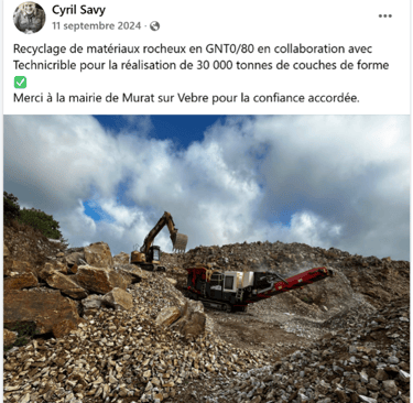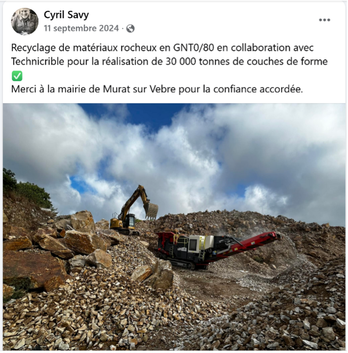 Monsieur Cyril Savy est président de la société Averous. Le 11 septembre 2024 il publie sur son Facebook et remercie la commune de Murat. Rappelons que le conseil municipal a délibéré au sujet de ce don des déblais le 17 mars 2025. Il est intéressant de constater que monsieur Savy fait état de 30 000 tonnes. Or dans la délibération il est fait état de 3 000 tonnes laissées à la commune, qui représenteraient 1/3 du total du déblais. A Murat un tiers de 30 000 c’est donc 3 000.