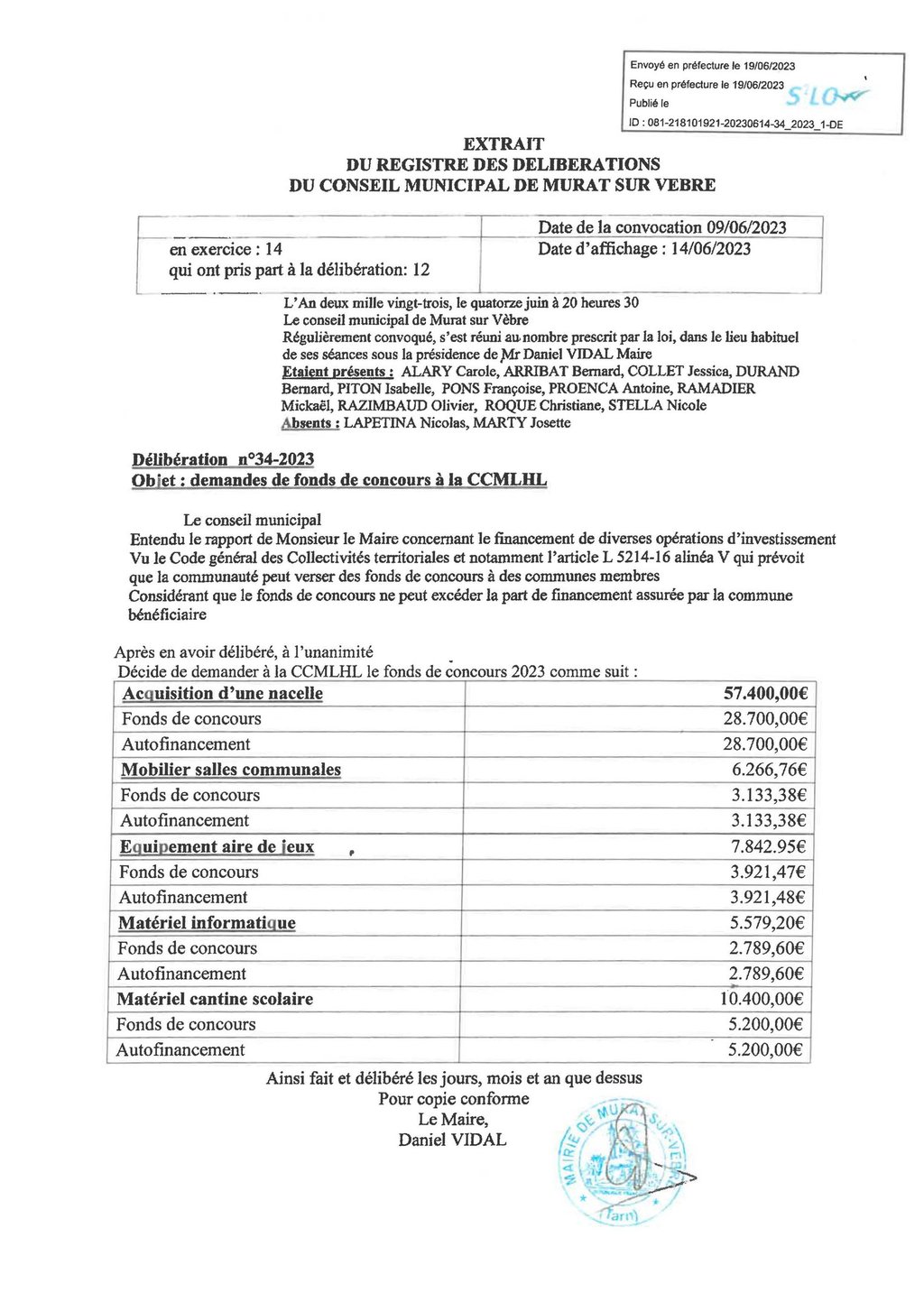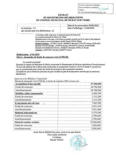 Le 14 juin 2023 une délibération a été prise pour demander un fond de concours pour l’achat d’une nacelle d’un montant de 57 400 € sans doute hors taxe. Or, sauf erreur de notre part nulle trace de délibération à ce sujet. Pourtant, dans la mesure où le montant est supérieur à 40 000 €, cette délibération aurait dû être prise. Ainsi, il aurait, pu être discuté de la nécessité d’un tel investissement. Il semblerait qu’un recours à une location en cas de besoin aurait pu être évoqué. Ça se discute… et surtout un tel achat doit être délibéré.