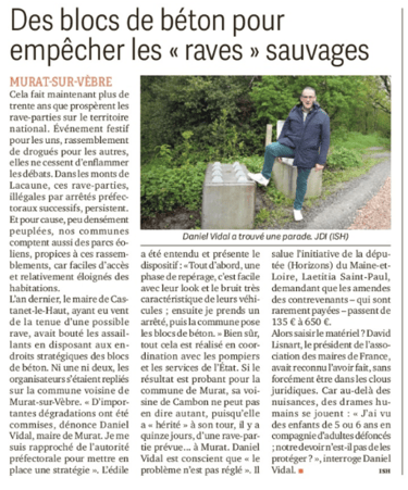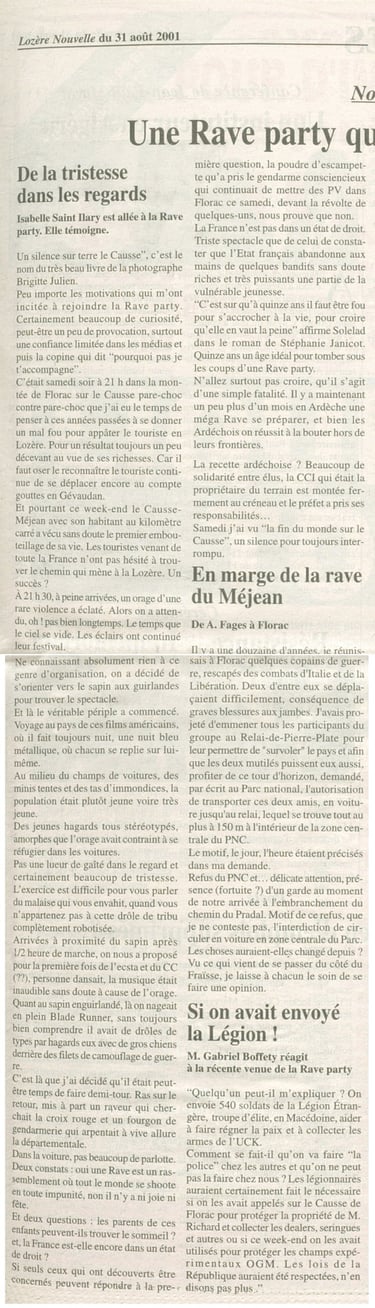 Tout d’abord, j’ai écrit deux articles traitant des rave party à Murat sur Vèbre. Vous pouvez prendre connaissance dee celui où monsieur le maire avait mis un dispositif bloc de béton en place. Je vous adresse également un article que j’avais rédigé en aout 2001, lors d’une rave party qui a réuni quelques 14 000 teufers sur le causse Méjean en Lozère.