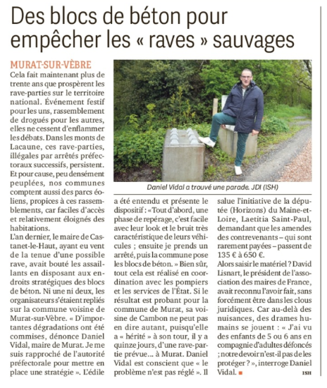 En ce qui concerne les rave party, qui fleurissent aux beaux jours sur nos communes des monts de Lacaune et de l’Espinouse, j’ai pu échanger longuement à ce sujet avec les muratais(es), les maires, l’ancien préfet du Tarn Xavier Lauch et même avec David Liesnard le président de l’association des maires de France. J’ai acquis la conviction qu’un maire, tout seul, est complètement impuissant à empêcher l’installation d’une rave party sur sa commune. C’est au niveau national que cela doit se régler. Pourquoi n’y a-t-il plus de rave party en Espagne et en Italie ?