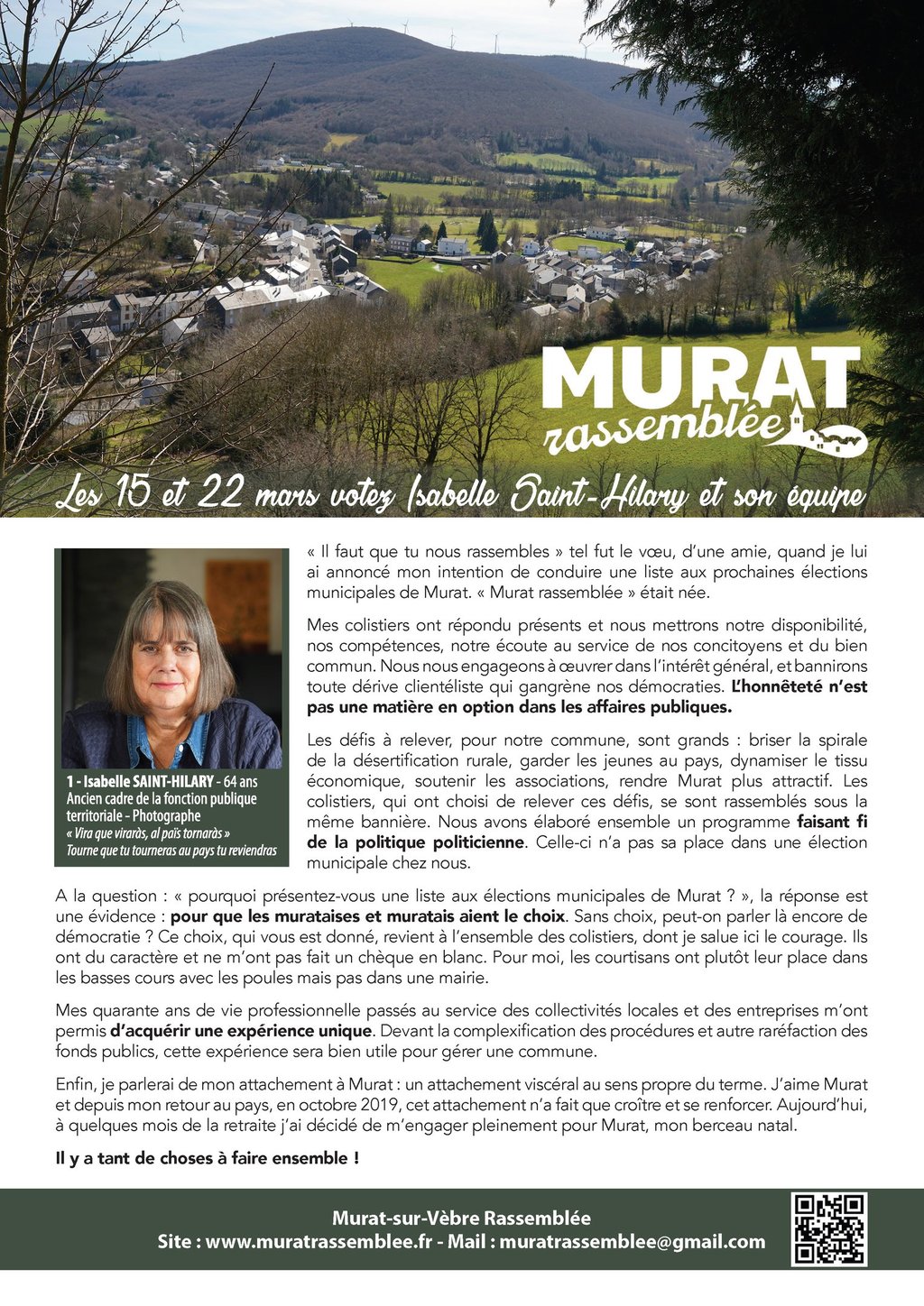 "Mon mari et moi sommes un couple de trentenaires installés sur la commune depuis l’année dernière. Tous deux chefs d’entreprise, nous avons la chance d’avoir des activités qui nous permettent de travailler entièrement à distance avec nos clients. Nous avons choisi de nous installer à Murat car nous cherchions un lieu immergé dans la nature, avec de l’immobilier accessible. De par notre expérience, je pense cependant que beaucoup de choses simples peuvent être mises en place pour améliorer l’attractivité et l’accessibilité de la commune, ainsi que l’accueil des nouveaux habitants et l’accompagnement des entreprises qui contribuent à l’activité économique du territoire et à la création d’emplois."